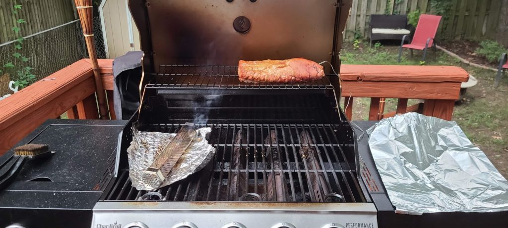 There are literally hundreds of configurations that can be used, here is ours. Note the burner that is on (if necessary) would be the one to the far left (under the smoke tube). This provides the indirect heat necessary to heat the meat. Under the smoke tube we have a piece of foil as mentioned above its because I’m lazy and don’t want to clean my grill for ash that falls down. If you have a charcoal grill there is no need but propane I’d find a way to catch as much as possible.